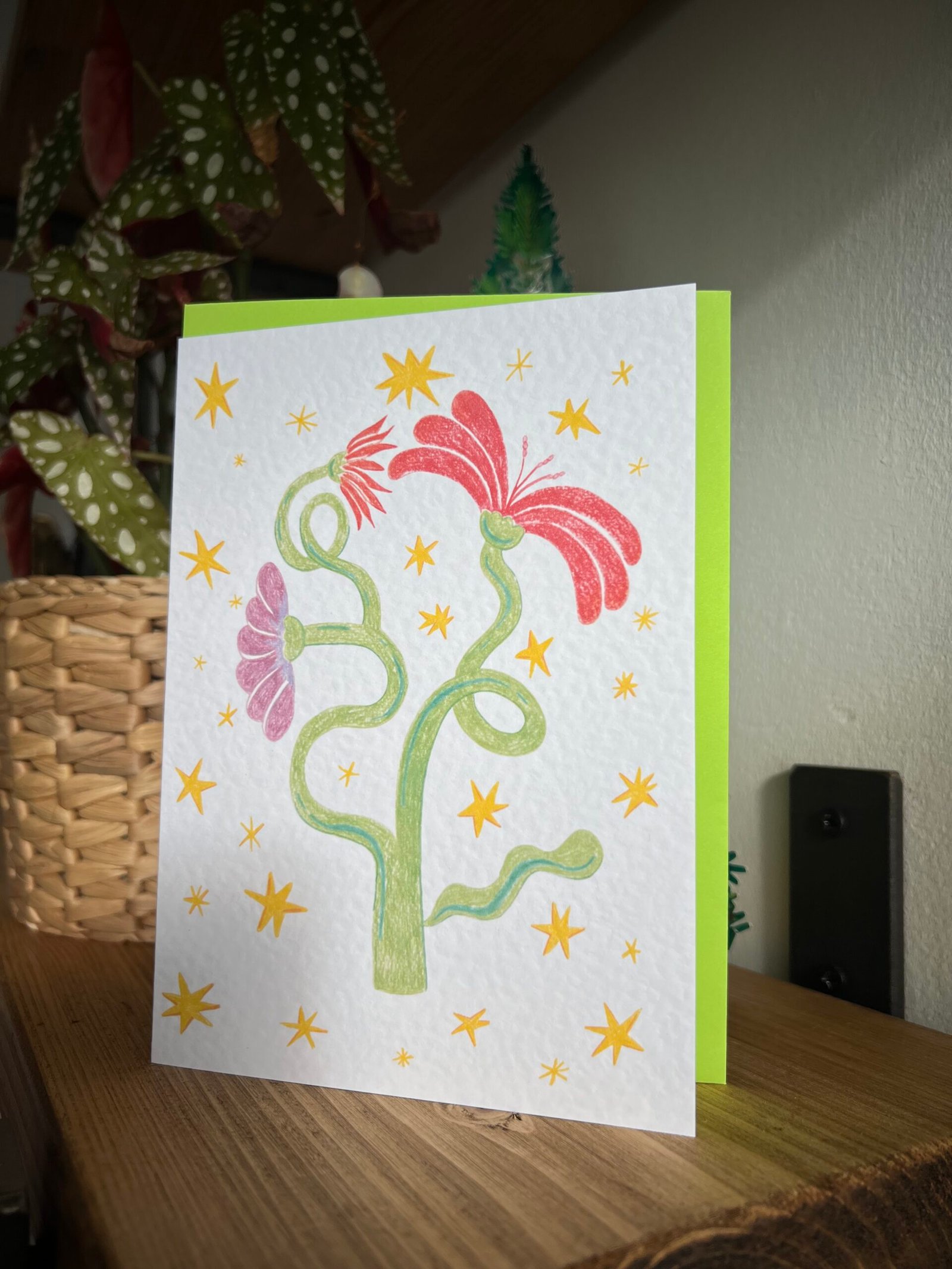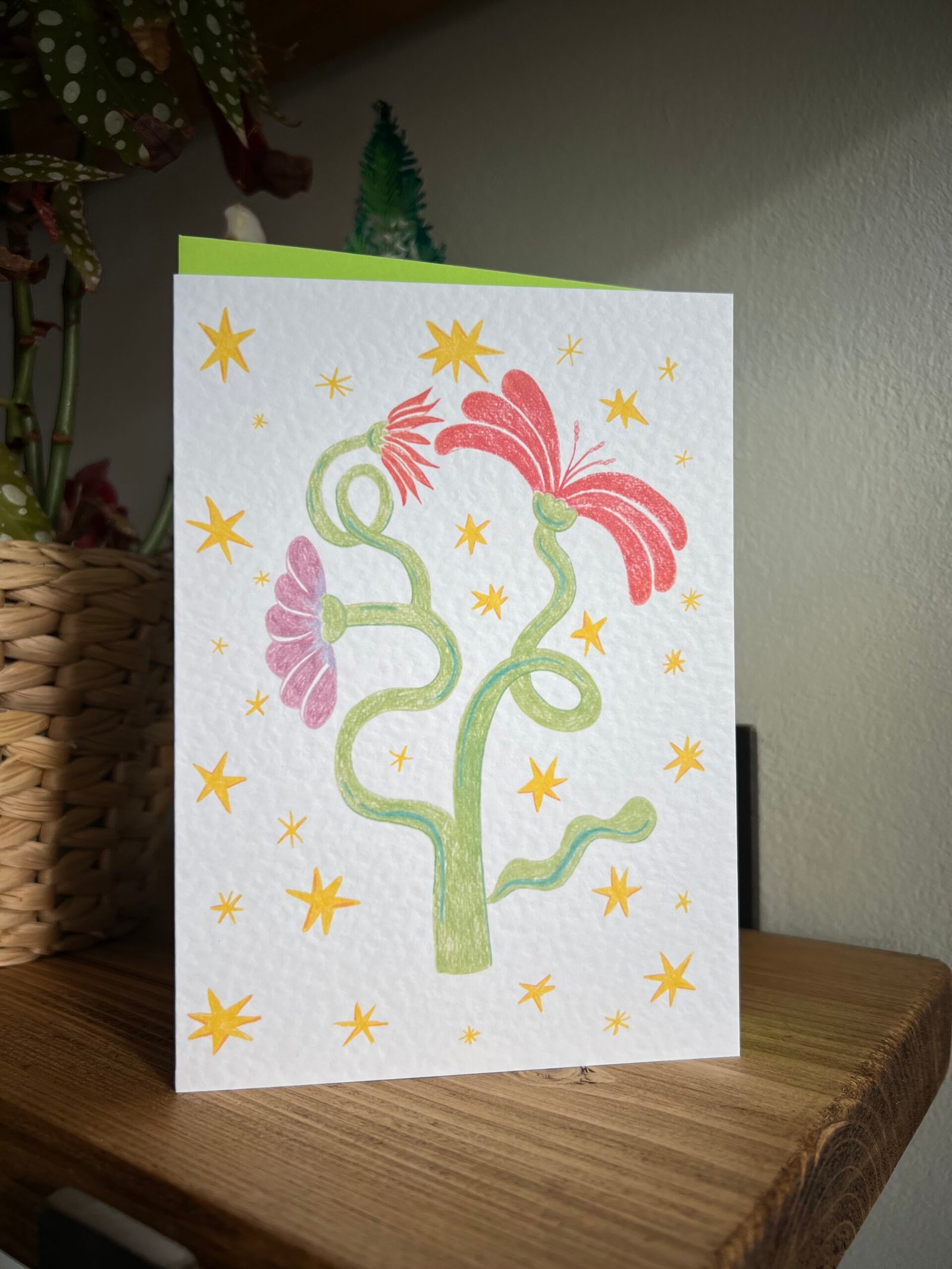 Drawing of a curly-stemmed plant with three flowers coming from it. The plant is surrounded by little yellow stars and is set on a white background. This card is perfect for numerous occasions, including birthdays, goodbyes, and well-wishes.