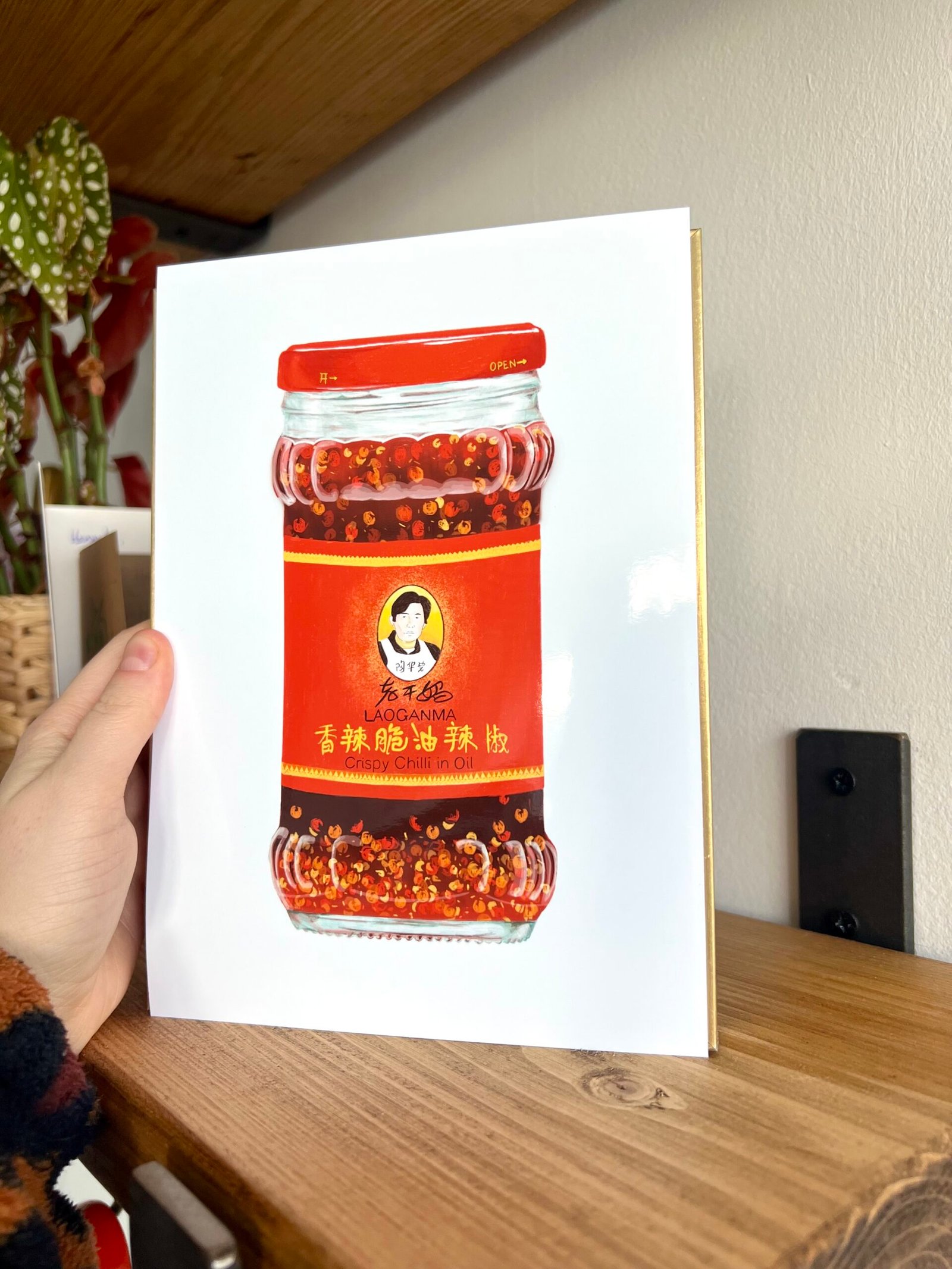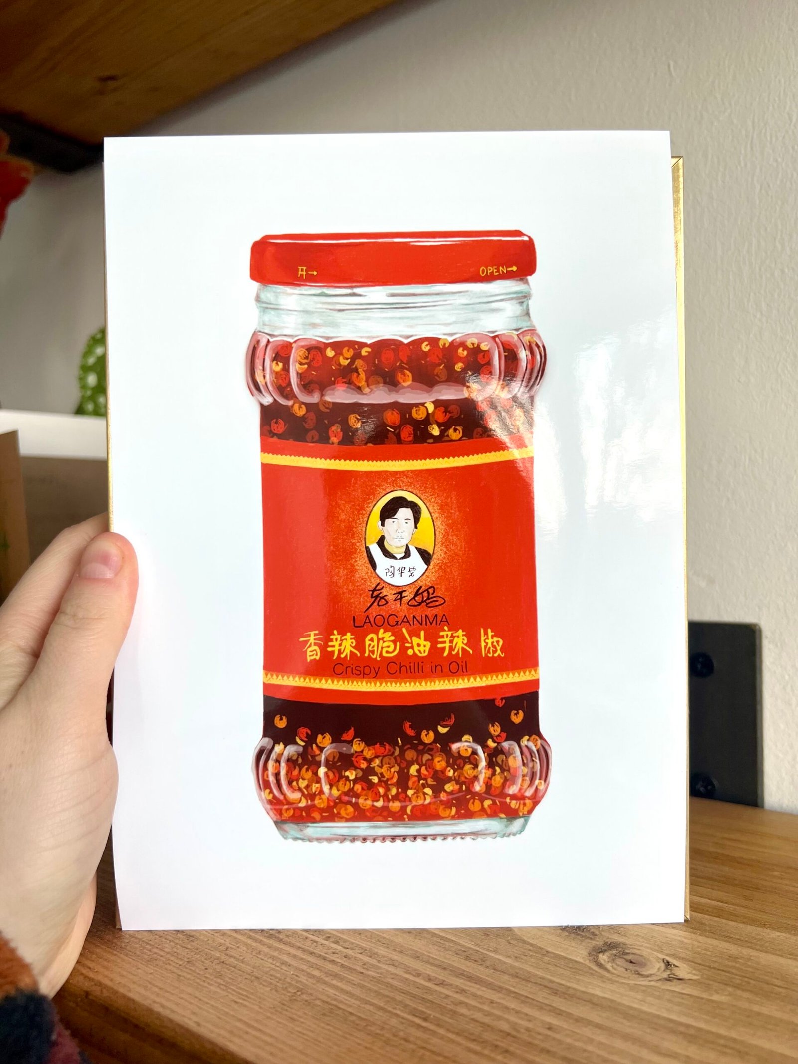Laoganma crispy chilli oil drawing. Layers of red, orange, and yellow mirror the layers of rich flavour in this famous chilli oil. Complimented by the blues and greens of the jar, the reflective shine makes the drawing jump off the page.